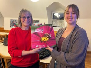 2. Vorsitzende Ruth Riedle begrüßte herzlich die fünf anwesenden JungimkerInnen. Roswitha Schlee durfte als neue Imkerpatin im Anschluss an die Versammlung das Begrüßungsgeschenk, einen Ordner mit Bienenwissen, an ihr „Imkerkind“ Lina Meier überreichen. Herzlich willkommen im Verein!